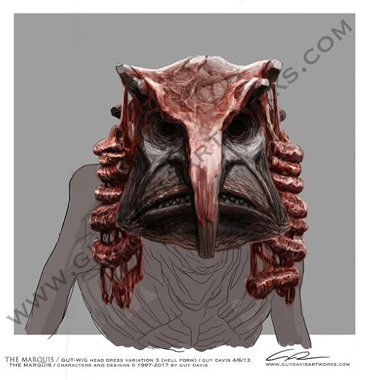 For the rework of the design, I kept the base form but added details that wouldn’t be as clear in the comic, the added fun part for me was also designing a bunch of variations of 18th century wigs made out of guts!