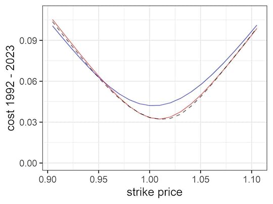 Comparison of straddle option pay-in for Black-Scholes model (blue) and quantum model (red), with expected pay-out (dashed). The Black-Scholes model misprices at-the-money straddles by about 40 percent.8. Since the Black-Scholes model is the industry-standard pricing model, it makes sense that model error will lead to mispricing in option markets. This prediction was verified by Larry Richards who analyzed CBOE data for over 25,000 1-month SPX option prices from 2004 to 2017. So much for efficient markets. See our paper published in the March 2023 issue of Wilmott.