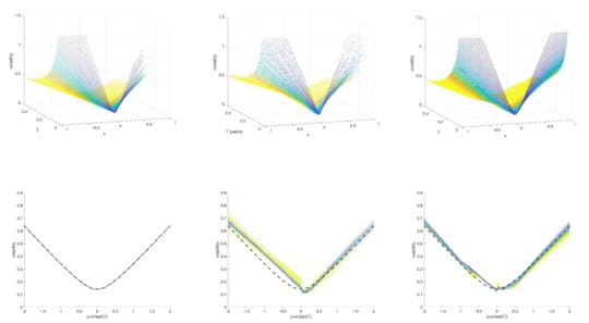 RMS annualized volatility for the S&P 500, plotted against normalized price change, for periods of 1, 2, 4 and 8 weeks (dark to light). Dashed line is the quantum prediction.5. Implied volatility is not the same as actual volatility, because it is found by fitting a lognormal option pricing model to data that is not actually lognormal, and is affected by trader behaviour. So it was interesting to find that the quantum model produced an implied volatility surface very similar to what is found in the wild.