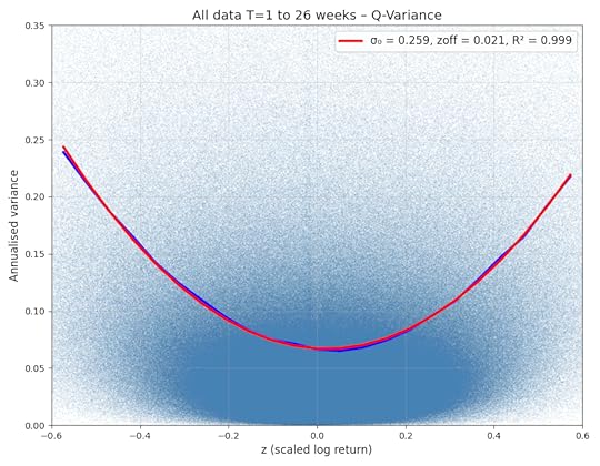 The test of course is whether q-variance and the associated q-distribution are consistent with data. The figure below shows variance as a function of z=x∕√T for 355 stocks for the period January 1992 to April 2025. For each stock, the results are compiled over periods T of one to 50 weeks. Companies included are currently in the S&P 500 index and have data for at least 75 percent of the period. Blue line is the mean, red line is the quantum model with a small shift to account for effects such as skew.