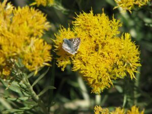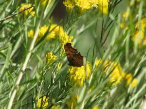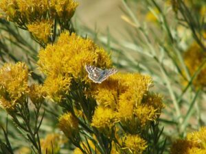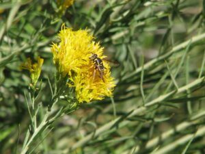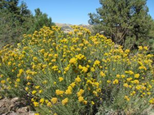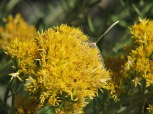 Both rubber and Douglas rabbitbrush thrive in this area. The latter is smaller and easily identified by its twisted leaves. The larger rubber, or gray, rabbitbrush (Chrysothamnus nauseosis) is also known in Spanish as chamisa. The plants are considered undesirable by ranchers, but they’re browsed by deer, rabbits, and pronghorn, and the seeds are a food source for overwintering birds. Native tribes used branches from the plants in tanning hides and as coverings for sweat lodges, and boiled the flowers for yellow dye. Given that accounts I’ve read say that the flower clusters have to be boiled for six hours, making the dye bath over an open fire would have been an enormous commitment. Modern weavers and fiber artists still use yarns tinted with chamisa.