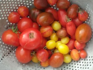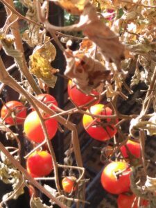 But I had pulled up the tomato plants before they froze, hanging them upside-down in the greenhouse so the immature fruits could slowly ripen despite their small size. They did, and I harvested fresh tomatoes right through to Thanksgiving.