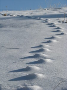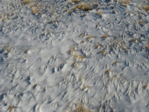Cast of coyote track imprints, left after the surrounding snow was blown away.