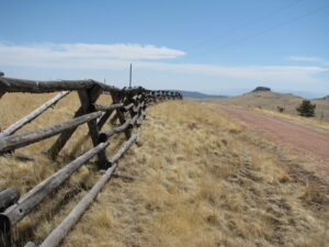 The buck and rail fence up the road a ways, which was rolled by the wind–twice–before the owners staked it down with rebar and installed outriggers (that log on the ground sticking out to either side of the cross-rail support).