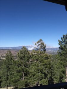 On May 12, I texted my husband a picture looking northeast from our deck, saying simply, “And so it begins.” A smoke plume had erupted on High Park, a flat that stretches between our place and Pikes Peak. As the fire spread that afternoon, pushed eastward by whipping winds, the southern front broke over a low rise, revealing an orange frill of flame at the base of the billow of smoke. Through binoculars, I could see those flames torching individual trees—at which point I stopped looking through binoculars.