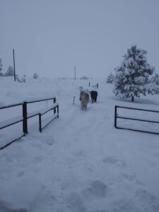 January at our elevation and from our exposed position makes for unkind outdoor conditions. As I write today, for instance, we are experiencing a daytime high temperature in the low teens with gusting windspeeds in the mid-thirties. Snow that fell night before last is airborne, swirling up rather than drifting down. When I went out to hang haynets for the horses, Harper—who is normally aloofly bossy—expressed her anxious displeasure with a string of plaintive whicker-whinnies, the likes of which I’d never heard her utter before. If I had a translate button, I wager that the transcript would read Wh-wh-h-hh-y-y-y-y? Wh-wh-h-hh-wh-y-y?? On the way back inside, I detoured to retrieve the snow shovel I left leaning next to the door yesterday. The wind that had sent it skidding across the driveway proceeded to snatch it back out of my hand.