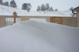 A week later, the terrific dump of snow has melted. The ground was too dry to tolerate mud: the water simply vanished into parched soil. The moisture has brought a surge of greening grass, though, springing up practically as I watch. It’s already tall enough to shiver under the wind of today’s Red Flag warning.