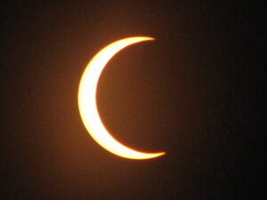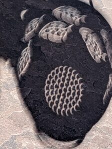 Eclipse through the colander, with leaf cutouts transformed into fish.