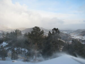 The scale was originally conceived to account for sustained winds on the open ocean, so maybe my high-altitude expectations are pushing the limits of its flexibility. Here in the central Rocky Mountains, the wind is often sustained, but mountainous terrain pushes it into variable and gusty behavior, with effects unevenly distributed. Our winds zither down ridges and roar over buttes; they whoosh through drainages and swirl into bowls. At the barn, which is sited in a sheltered depression, I feel the gentle fingers of a Force 2 on my face while the ponderosa pines uphill sway in the white-noise rush of a Force 4.