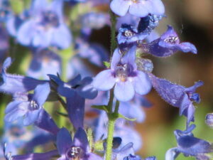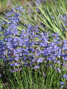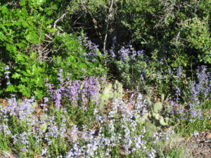 Blue Mist Penstemon (Penstemon virens) doesn’t mind the company of its kin—if fact it prefers it (one source I looked at recently asserts that plants are rarely found singly). The species likes open sites with an unobstructed south-facing view. When conditions are right, as they were this year, their congregations do indeed create the effect of a pale smoky-blue mist on the rocky slopes they prefer.