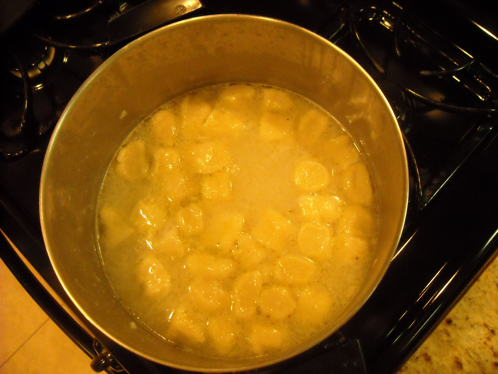 Adding boiled gnocchi to the pan with the chunky marinara...
