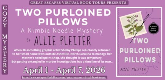 April 1 – Baroness Book Trove – REVIEW April 1 – deal sharing aunt – AUTHOR INTERVIEW April 1 – Storybook Lady – REVIEW April 2 – Jody's Bookish Haven – SPOTLIGHT April 2 – Boys' Mom Reads! – SPOTLIGHT April 2 - Sapphyria's Book Reviews – SPOTLIGHT April 2 - Sapphyria's Book Reviews – SPOTLIGHT April 3 – Christy's Cozy Corners – AUTHOR GUEST POST April 3 – MJB Reviewers - SPOTLIGHT April 4 – Ruff Drafts – AUTHOR INTERVIEW April 4 – Books, Ramblings, and Tea – SPOTLIGHT April 4 – FUONLYKNEW – SPOTLIGHT April 5 – Cozy Up With Kathy – REVIEW, CHARACTER GUEST POST April 5 – StoreyBook Reviews – AUTHOR GUEST POST April 6 – Reading, Writing & Stitch-Metic – AUTHOR GUEST POST April 6 – Sarandipity's – CHARACTER INTERVIEW April 7 – Escape With Dollycas IntoA Good Book – REVIEW April 7 – Salty Inspirations – CHARACTER GUEST POST 💠✂🪡🧶🖼️🪢💠✂🪡🧶🖼️🪢💠BLOG TOUR GIVEAWAY:Prize package will include a signed hardcover copy of TwoPurloined Pillows (A Nimble Needle Mystery) by Allie Pleiter, bookmarks, and aNeedlepoint starter kit.