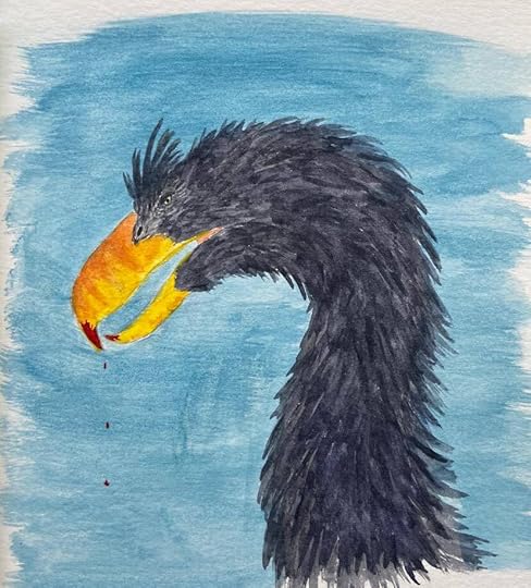 Turning around, he finally got a good look at the terror birds. Their black feathers shimmered with a hint of iridescence. Those bright yellow beaks were as long as his arm, sharp as axe blades. The coloration suggested an absurd image of giant toucans. Their legs looked too powerful even for beasts of that size, wrapped in exaggerated muscles. Four great yellow eyes glared at him with pitiless hunger.