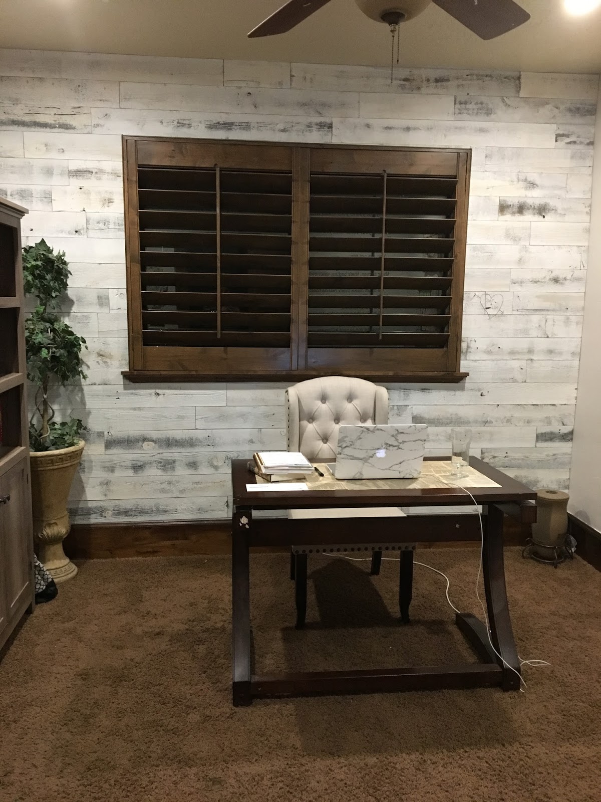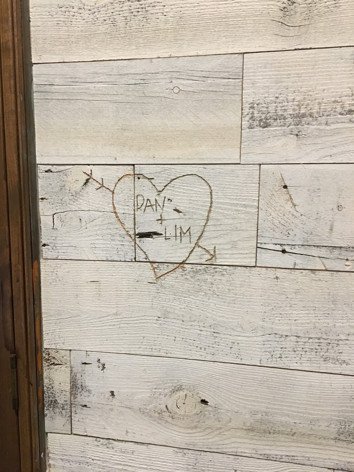 This wood panel wall is AMAZING. It's reclaimed weathered wood we purchased from Stikwood. My father and husband spent an entire Saturday cutting and installing the wood, and it's a perfect accent wall that adds so much character to the space. My favorite part is the DAN + LIM heart my husband carved into the wood with his knife. I love it so much!