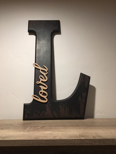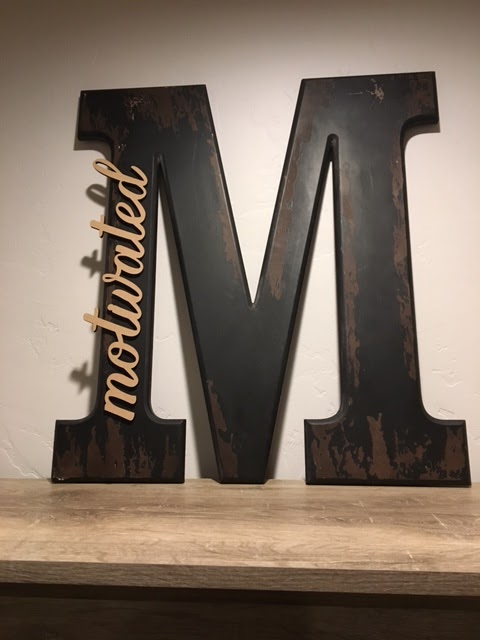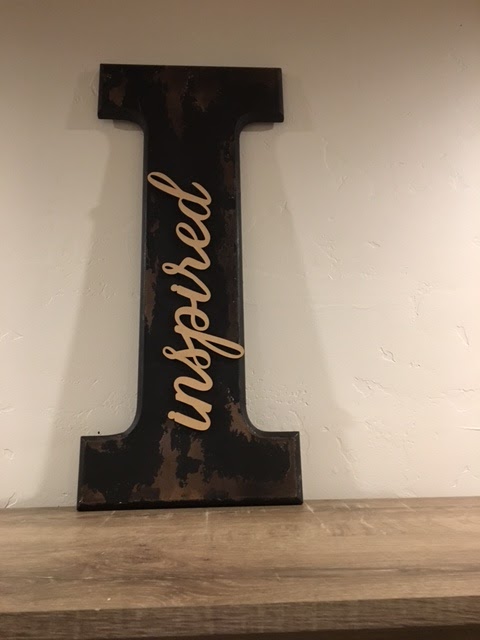 Lim is my nickname, what my family calls me, and my husband came up with my motto: loved, inspired, and motivated, using each of those letters. He says that's exactly what he wants me to feel when I enter my writing space: loved, inspired, and motivated. I love that so much! So I ordered the wooden word cutouts on Etsy and glued them onto these giant letters that were on clearance at Hobby Lobby. Score!