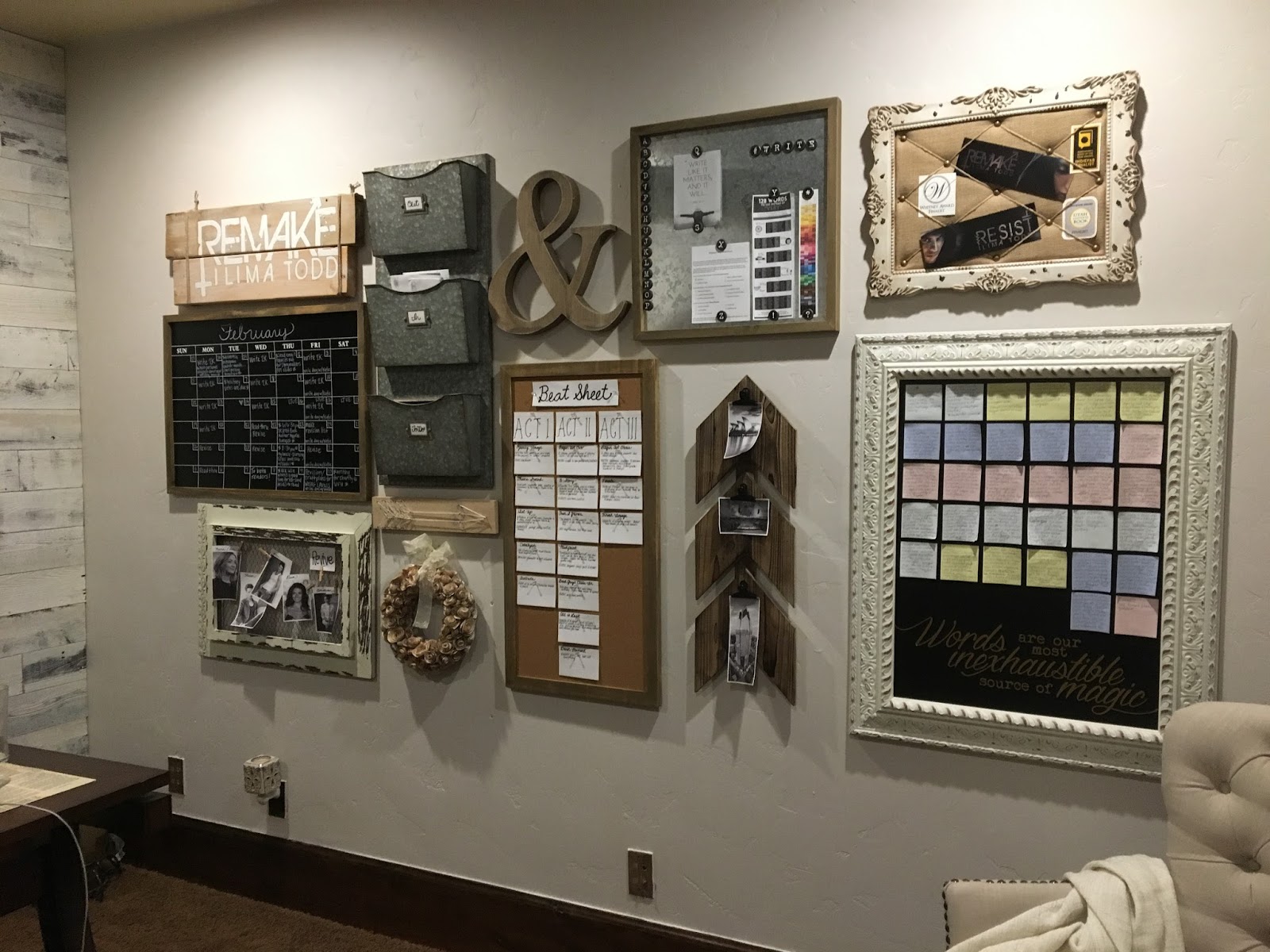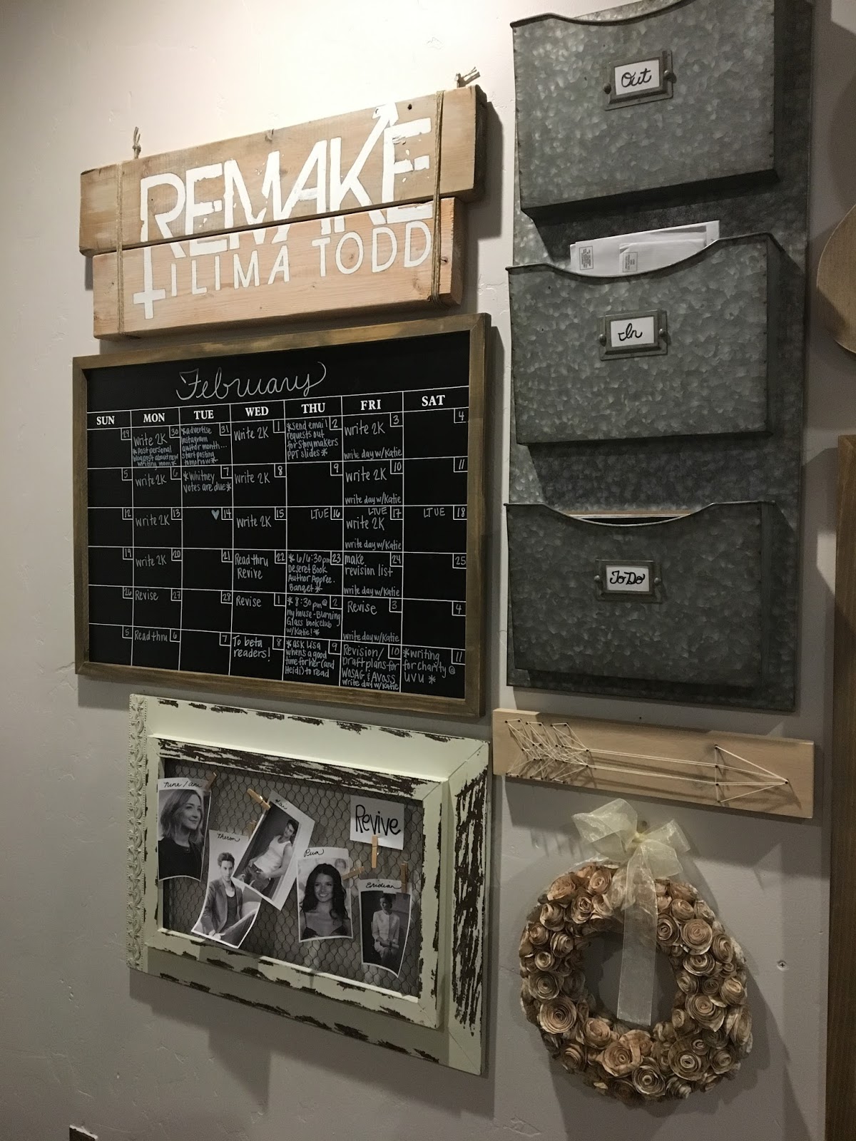 Here's my wall of inspiration. It's a collage of boards and displays filled with writing goals and plans I can work from as I write. There's a calendar with my writing goals for the month, character pics from the book I'm currently writing, book outline, inspirational quotes, etc. The small details like fan-made Remake art, a wreath made out of pages from Harry Potter, an arrow my daughter made herself, and a small display of awards my books have earned make it a happy and personal space for me.