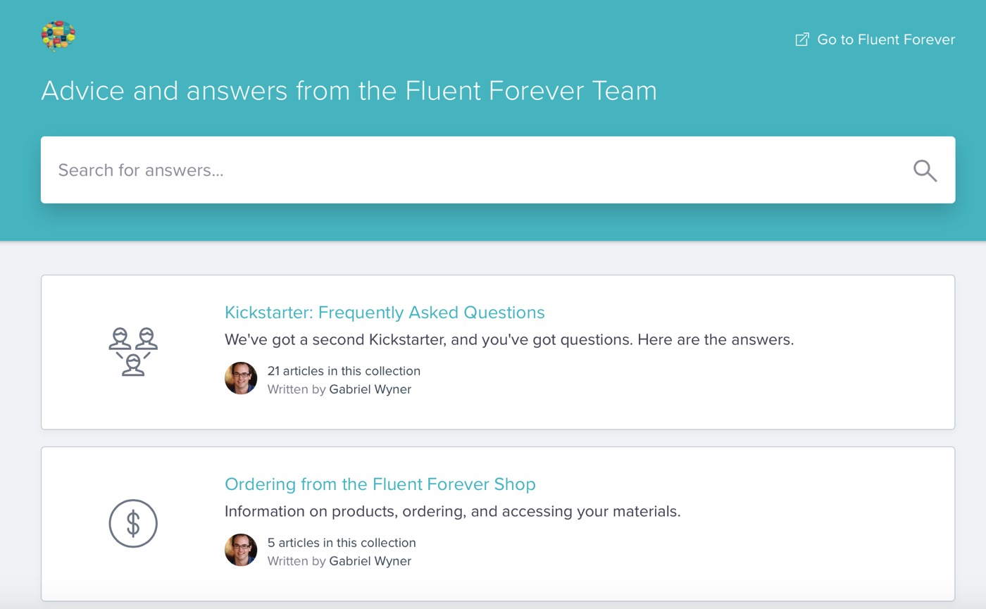 Announcing the Fluent Forever Knowledge Base: a giant, organized and searchable database with answers to your frequently asked questions. We’ll be expanding it as time goes on, but it already has a bunch of content (and a lot of exciting stuff about the new Kickstarter), so check it out at: http://help.fluent-forever.com