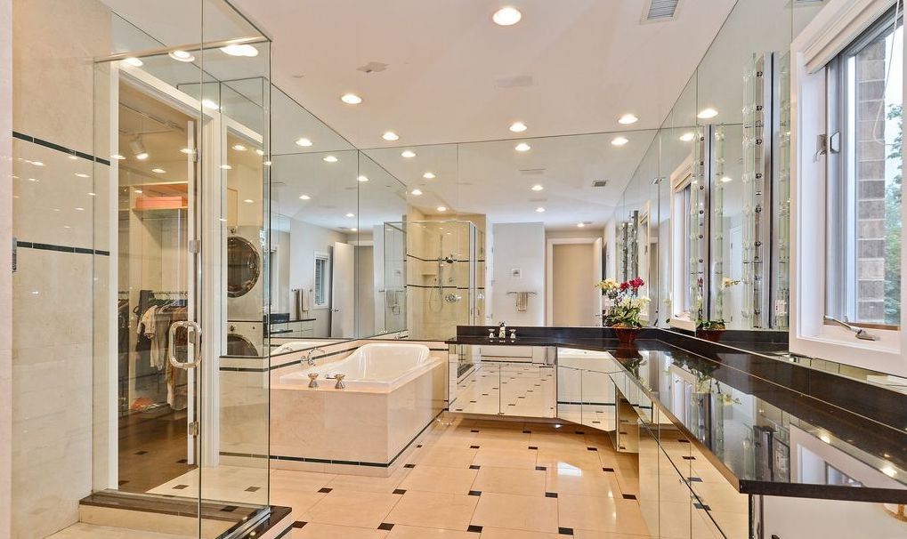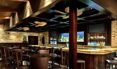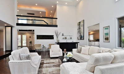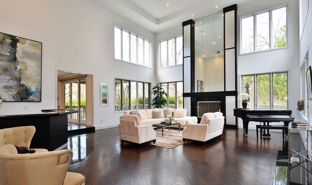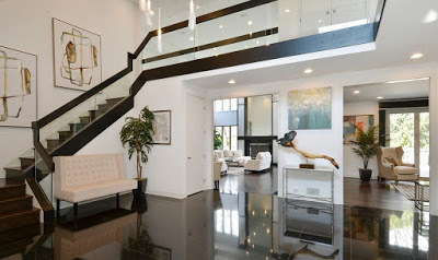 The entrance with the infamous ivory sofa below the stairs. It leads into the living room area where there is the bar, the fire place and piano.