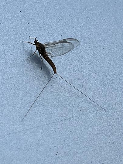 Image shows a mayfly siting on a pale metal surface. Image copyright Mabh Savage 2023The mayfly’s butt wiggles and those