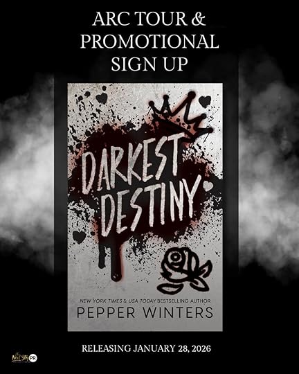 Darkest Destiny by Pepper Winters Releases: Jan 28th Genre: Dark Romance w/ a twist Tropes: Romantasy, Fantasy Romance, Captive, Enemies to Lovers, Billionaire, Not What He Seems, Anti-Hero, Touch Her and Die SIGN UP ↳ https://bit.ly/DarkestDestinyReleaseP...