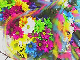 First person I see is an old woman walking down the street with a mean, unhappy look on her face. She’s African American (or is it Black? I have friends who confuse me because they use different terms for themselves). Anyway, she’s not dressed very nice at all, and I’m being nice about that. She looks tired. And sad. So I jerk into the ice cream parking lot next to the sidewalk she’s walking on and jump out with one of my wacky-colored daisy bunches and say, “Hey, excuse me!” She stops walking and turns around. I run up to her and hold out the flowers. “I’d like you to have these,” I say.