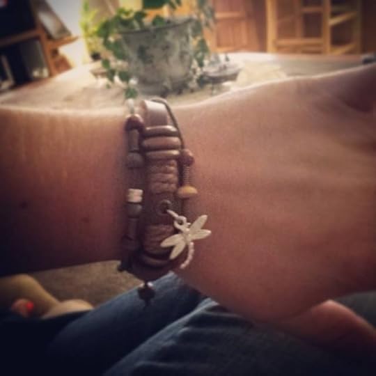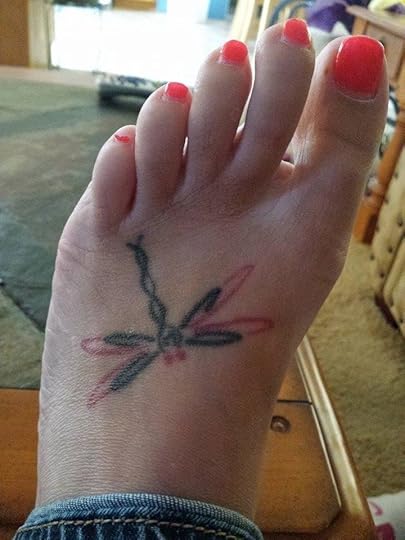 You all know how I love RAK's (random acts of kindness), so last night I was sitting on my back porch after midnight cruising the Internet when I came across a young lady on my personal Facebook. Not sure how she got there, I keep page that slimmed down, I don't know her, and she isn't one of my readers, but there she was... A fiercely beautiful young mom of two boys. Looks like she's had a rough time lately, and I saw from her posts she'd recently had surgery, and was having complications. So I sent her a meme of a smokin' hot guy demanding she get well soon, and we struck up a chat. She asked where to buy one of my books, said she prefers print, and I just happened to have a print copy, so I offered to mail it to her. Welp, turns out she lives only 30 minutes away!!! But wait...it gets better. This morning I put together a 'bed-rest package' of my book, chocolate and a bracelet for her...cuz...well, who doesn't feel better with reading, chocolate and jewelry?! I drove it over and left it with her mom, who lives on the same road as she does. When I got home, she had posted a thank you, loving the bracelet, because as it turns out, she loves dragonflies! Of course, the bracelet I gave her has one tiny dragonfly charm, because ya'all know I lurvvve dragonflies. Then she sends me a pic of her foot... Check it out. A freakin' dragonfly tattoo!! Oh boy, wait until she reads Let Me Go, she's going to trip out! Life is just one big series of coincidence's...or is it? Get well, young E-Girl! And I hope the dragonfly brings you healing!