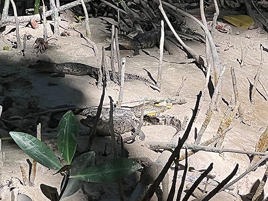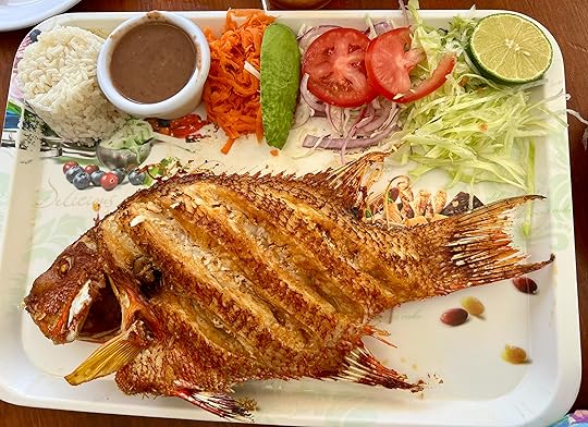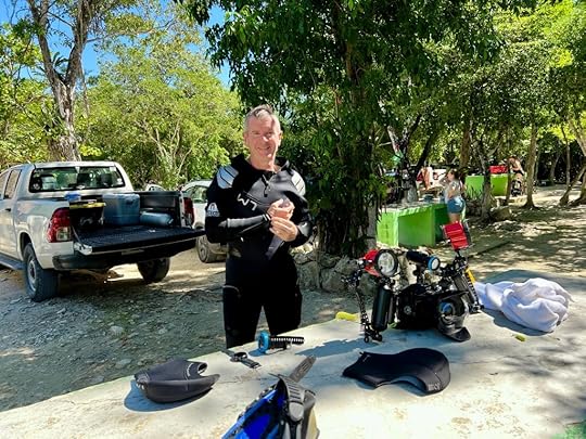 The second dive is a shallow cave network, Dos Ochos (two eyes) and we follow a line through the caverns leading to a Barbie doll being eaten by a croc at the midpoint. It is a popular site, with snorkellers and other divers, but doesn’t feel crowded. And in fact Im looking rather cool by the end, even waving at the camera. Afterwards we are dropped off in Playa for a really good – and cheap – fish lunch!