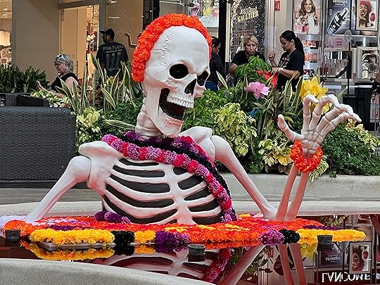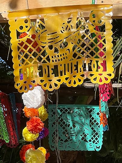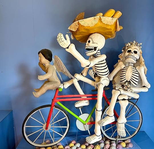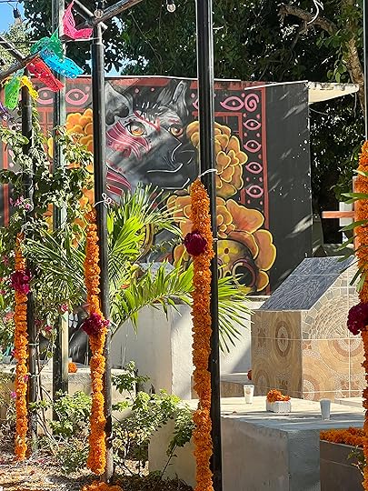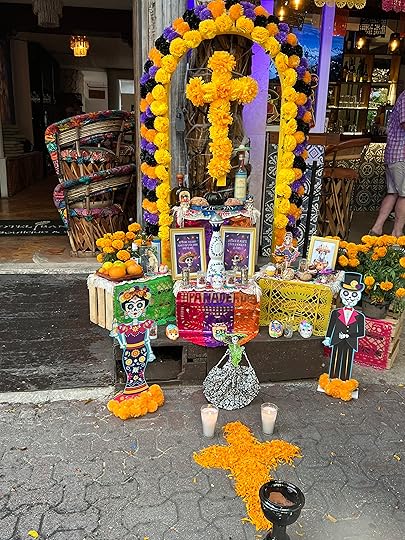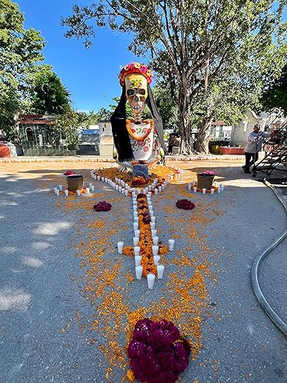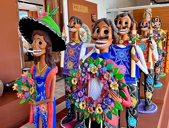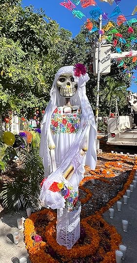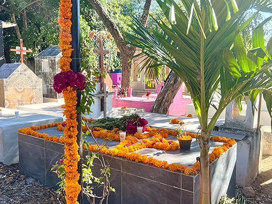 We visit the local cemetery to get a feel of the Day of the Dead celebrations – there is a BBQ in full swing, music playing, and effigies of skeletons and ghosts punctuate the spaces between the graves. These are also decorated with the ubiquitous orange flowers, and offerings of favourite food and drinks are left out. November 1 is the children’s day, while the following day is for the adults. Everywhere there are shrines and decorations honouring the departed – but it is more of a celebration than a mourning; we think of Louise in the cemetery and how much she would love her life to be remembered in this way – the colour orange one of her favourites, the dressing up and the feasting.