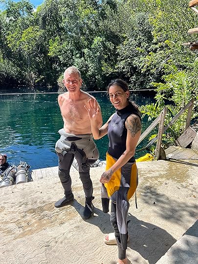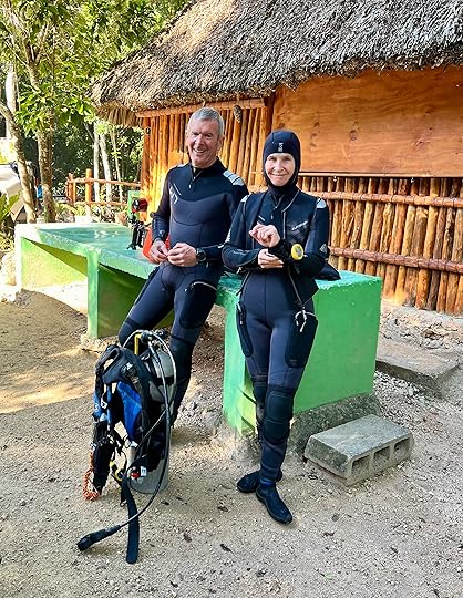 As for the diving – well this is not something I had been looking forward to. Firstly I hate being cold so we have bought new 5 mm wetsuits and new hoods. Secondly, I hadn’t realised how DIY it would all be – kitting up by the truck in a car park is quite challenging! Luckily on our first day Victor, the guide, hefts my tank and reg down the steep steps to the dive platform to enter The Pit, one of the deepest and most recently discovered cenotes. Quite honestly I am deeply anxious as I jump in, buoyancy in the new wetsuit in fresh water is extremely challenging and I am weighted down like a drowning puppy.