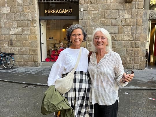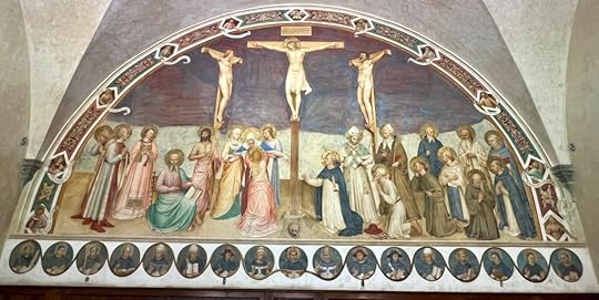 Fra’ Angelico’s masterpeice, Crucifixtion with the Saints, San MarcoThe last stop on our Grand tour is Florence, where our old university friend Debbie has lived since 1983! We only have two nights and one full day, with an afternoon and a morning on either side. Our fast train from Venice to Florence delivers us safely and we find the left luggage lockers before we sprint down to our rendezvous with Debbie, who has volunteered to whizz us round the Uffizi. On the way she poses with Hil outside one of her former employer’s buildings, Ferragamo!