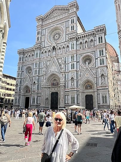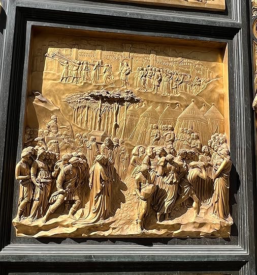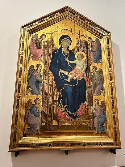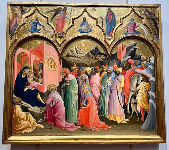 Debbie studied History of Art, and is an accomplished artist and sculptor herself; after years of living in Florence, she has strong views on what its worth seeing and what not at the Uffizi – basically everything early! She explains to us ignoramuses how medieval art really changed with artists such as Lorenzetti and Monaco introducing architecture and perspective, giving the works a sense of place, and the three dimensions, as opposed to the formulaic static portraits of Maddonas and Child, angels etc, however beautiful they might be! The Adoration of the Magi by Monaco, 1420 (below) is, in her opinion, a seminal piece, not only for the landscapes, but the introduction of an amazing colour palette and realism, exemplified by all the faces of the characters in the painting. We drink all this in!