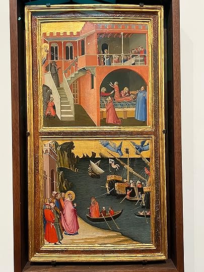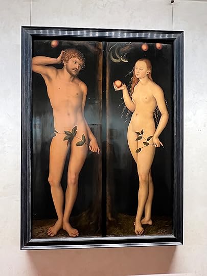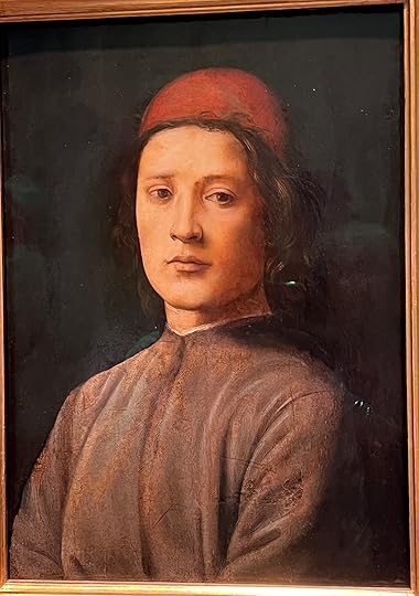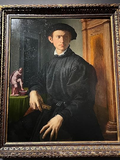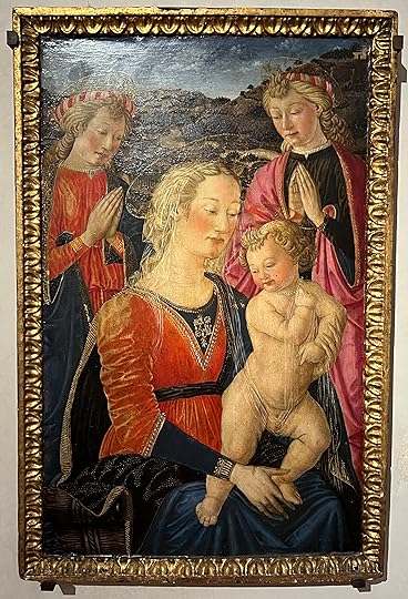 There are so many fine paintings but I will list myself to a few favourites: clockwise l-r: Lippi (1460-5); Messina (1470-3 – the Madonna’s face is so modern); Cranach the elder (1528); Bronzino (hard to see but the worsted wool detail is quite astonishing|); di Credi (1490 – just such a timeless face and wistful expression).