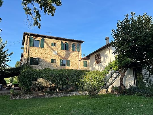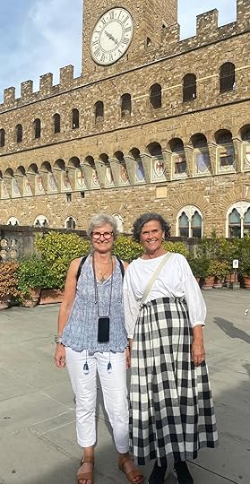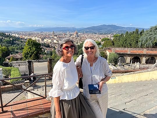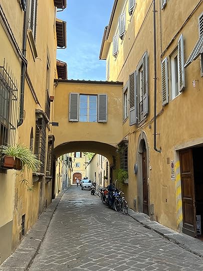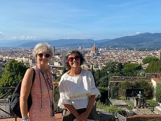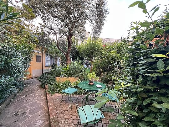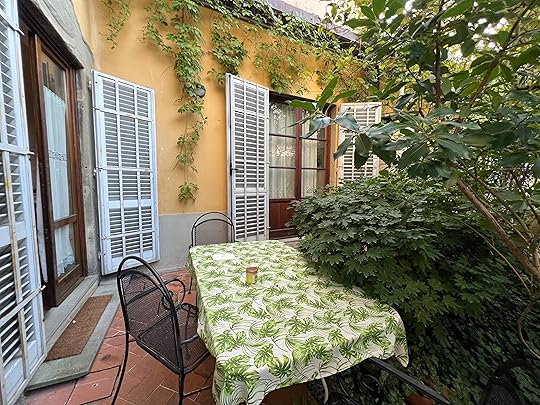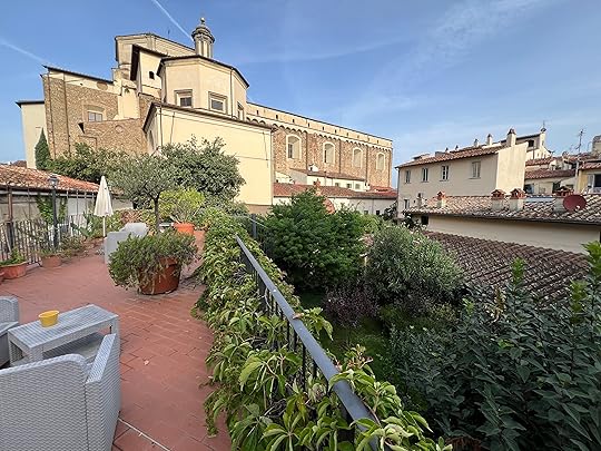 Finally we manage to find a taxi after our whistlestop two hours and arrive at our apartment Domus Giorgio in San Frediano. It is quite charming, old-school style – as Hilary says, it looks as if belongs to an old gentleman (books are eclectic, a biography of DH Lawrence, which Hil says her father had, and a Georgette Heyer, along with al the guides. It is well-equipped with Prosecco, tea coffee, fruit, drinks, biscuits. I thought it had two bedrooms, but there is one enormous double the street where we live!ed and a divan which looks most uncomfortable so we opt to share. There is also our own private outside space, plus a wonderful roof terrace with views of Florence.