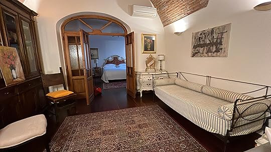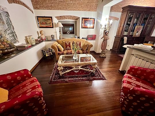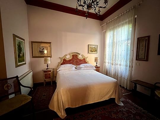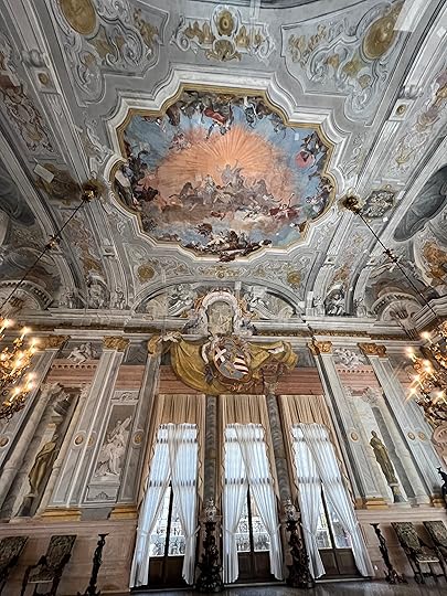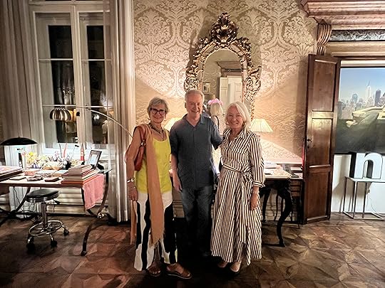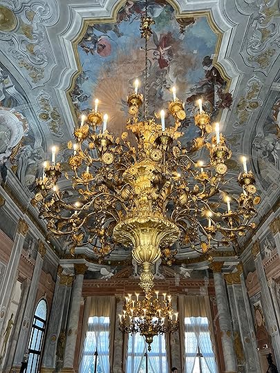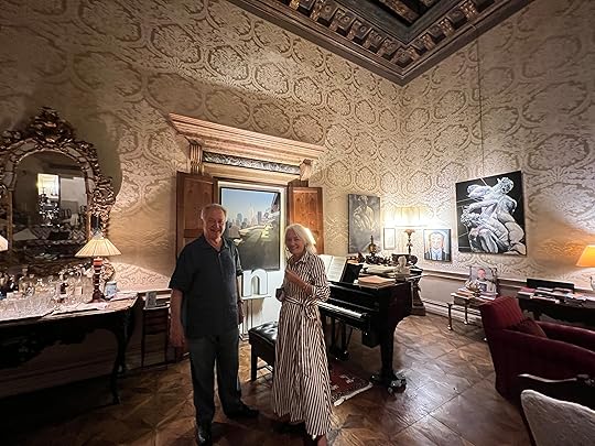 Our final appointment for the day is with Sandra’s friend, a Spanish concert pianist who has lived in Venice for 26 years, in three apartments in the same Grand Canal palazzo. It is a privilege to sip G&T, nibble elegant canapés, and learn about the side of Venice you don’t see as a tourist, and to admire his drawing room – the old ballroom. We are allowed to take a couple of photos as mementos, including of the grand piano. A special evening for our last in Venice. Thanks Sandra for arranging it!