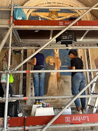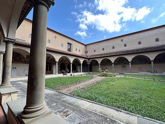 The museum is built around a leafy courtyard and was originally an old convent. Fra’ Angelico decorated most of the monks’ cells with frescos as well as altar pieces in the chapels and refectory. As we enter a fresco is being restored which is good to see. Below clockwise, detail from the main Fra’ Angelico Crucifixion and the Saints fresco (1441-2), Sogliani’s Miraculous Supper of St Dominic (1536); the cloister; the frescos in the cells; centre and left the restoration process; and last Rosselli’s Madonna (1480).