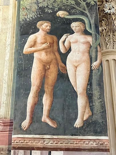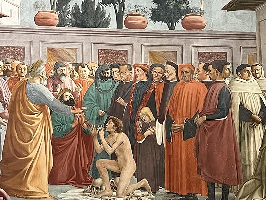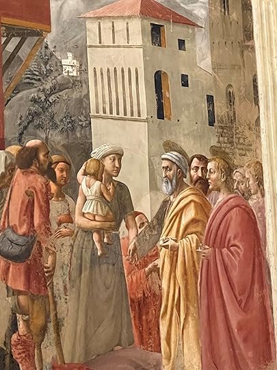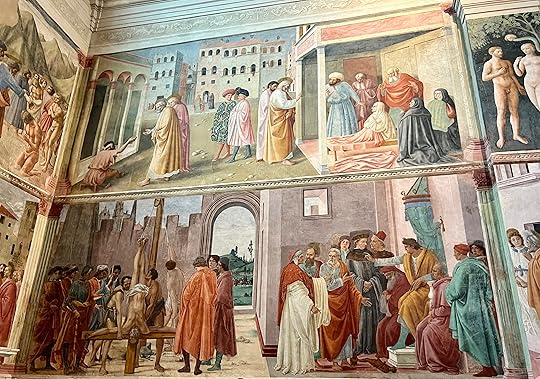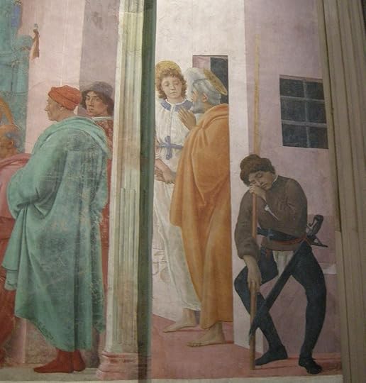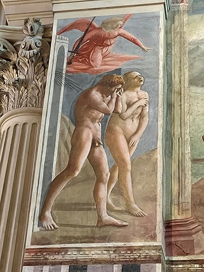 We manage to find a cab and meet Debbie in San Frediano for a very local lunch – she is well-known it seems and is greeted warmly wherever we go. She has booked a slot for us to see her favourite, the Brancacci Chapel. Here is the most wonderful set of frescos, started by Masolino but painted mainly by Masaccio, the better artist in fact (you can tell from the two depictions of Adam and Eve, the Masolino one on the left below being very static while the Expulsion from the Garden of Eden by his ‘pupil’ Masaccio is heartrendingly human (right, below). These frescoes are particularly famous for the very early use of perspective and the wonderful realism of all the characters who inhabit the paintings and mostly feature scenes from the life of St Peter (in the yellow robe). I particularly love the guard who has fallen asleep on his staff on the right-hand fresco