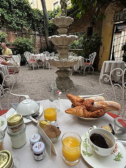 The mini bus ride to Venice is pretty straightforward and only Euros 30 (aside from a terrible accident which slows us up as soon as wee arrived in Italy|) – hop on, hop off! We are deposited in Tronchetto and find a vaporetto that takes us to San Marco, where it is a short walk to the delightful Hotel Flora. Down a side street, it was a former palazzo and is set around a leafy courtyard where we breakfast each morning. Our room is tiny (servants’ quarters we guess) but it is ‘location, location, location’. After a couple of yummy Venetian G & Ts we set off for dinner via La Fenice, where there are elegantly clad ladies and gents enjoying some sort of performance, taking a breath in the interval, to the restaurant Ai Mercanti, which I strongly recommend.