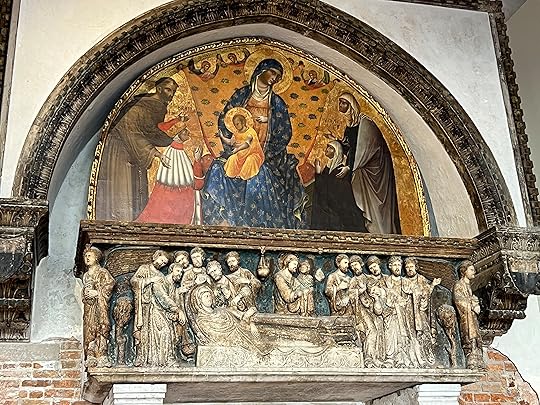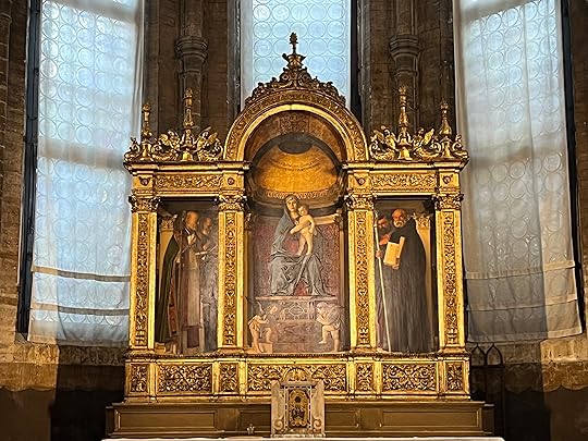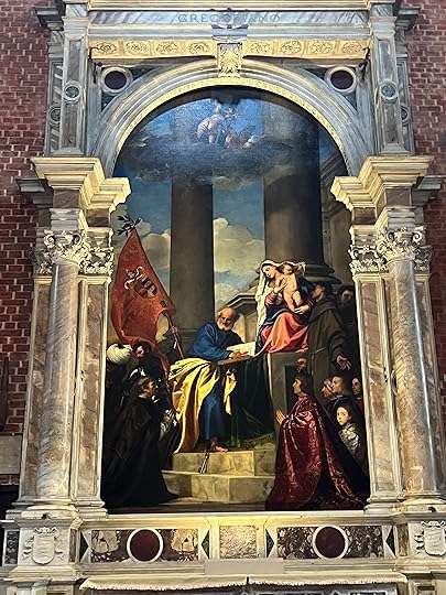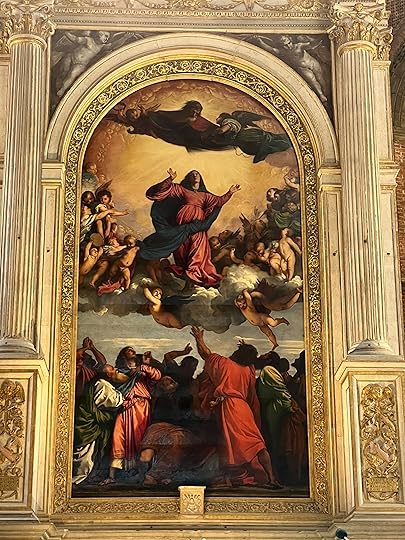 Our last stop on the way back is the Santa Maria Gloriosa dei Frari, to give it its full name. It’s massive and famous for its works by Titian (Madonna left, Assumption on the right), Bellini altarpiece(bottom centre, the Madonna enthroned by saints) and a statue by Donatello.