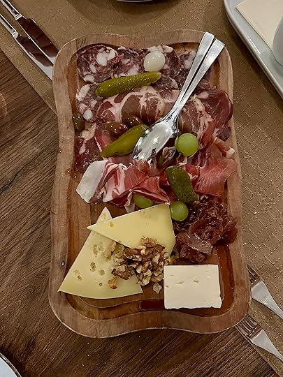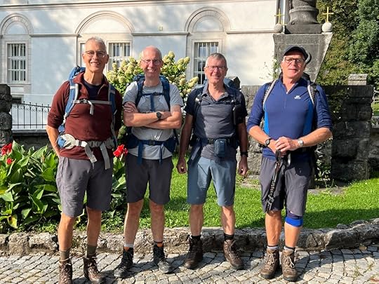 We have a delicious dinner (the only good meal in Slovenia, which is not known for its cuisine – very stodgy, lots of pork, sausage, meat, all well-cooked! Here I have lake trout). Then we repair to a bar to await the arrival of the other two walkers, David and Adam, who roll up at about 10.30. Just in time for a round of slivovitz!