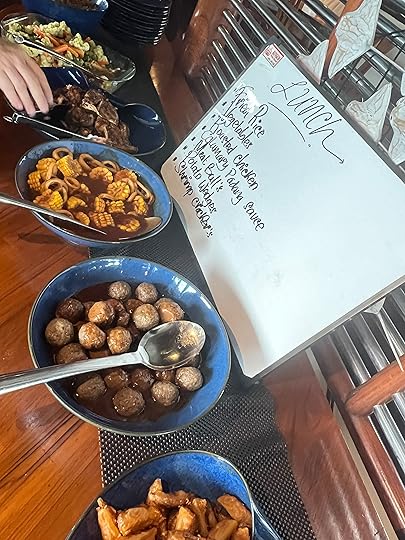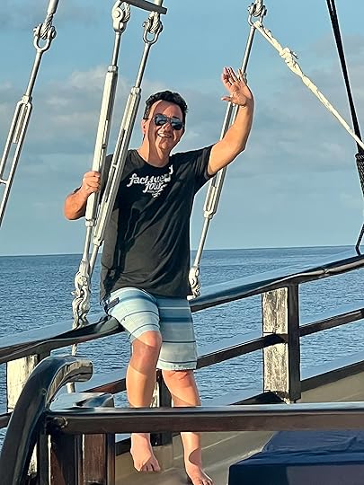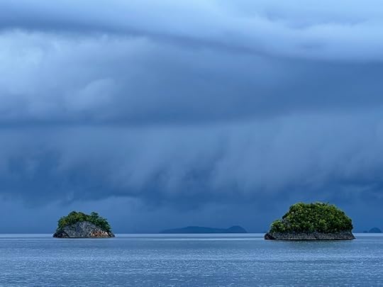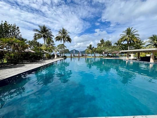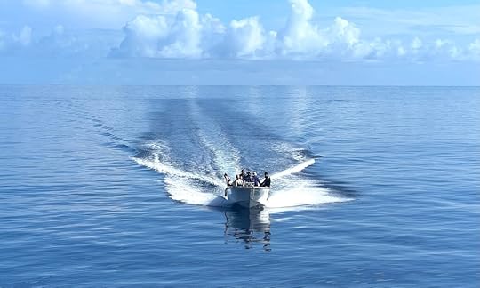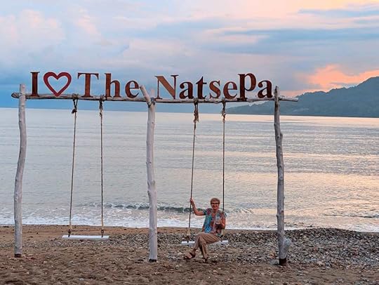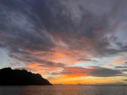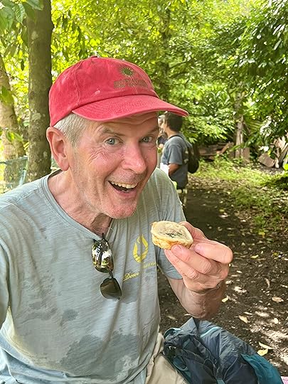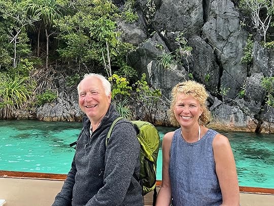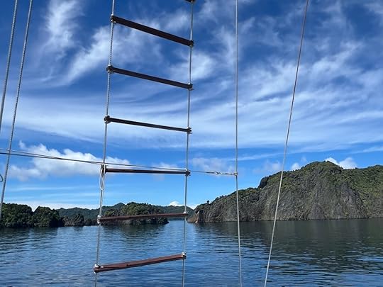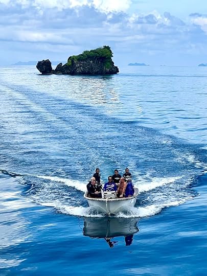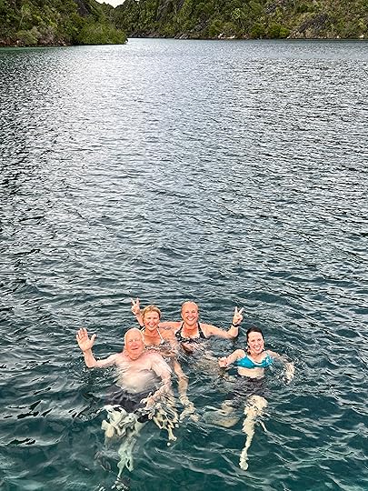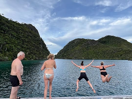 Our expedition to the heart-shaped lagoon, which we visited on our last trip, has to be curtailed to a boat trip and a swim, as the steps up are deemed too slippy (quite a relief tbh). Julian enjoys impersonating a dolphin to great amusement! The Tik Tok brigade are in full-swing mode…