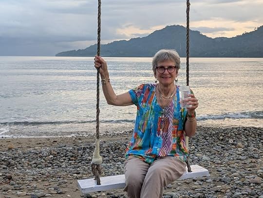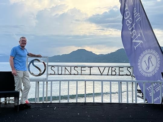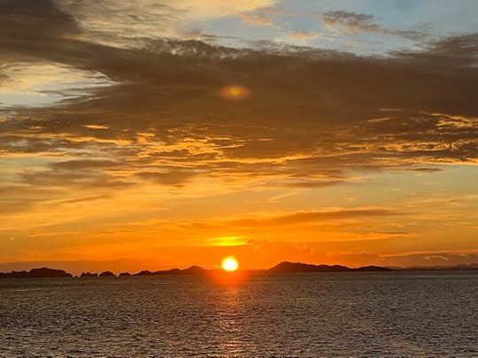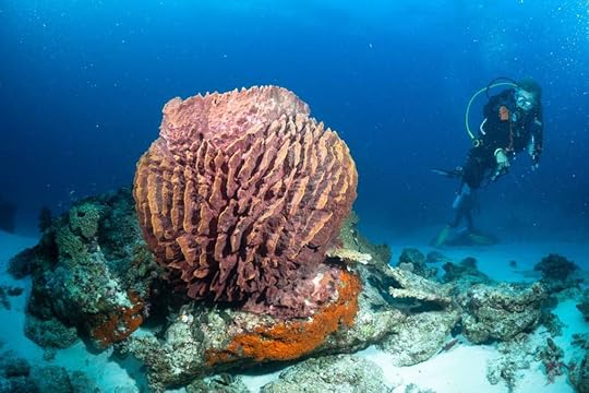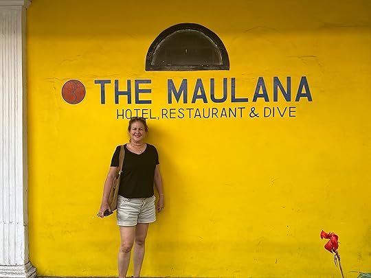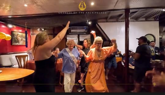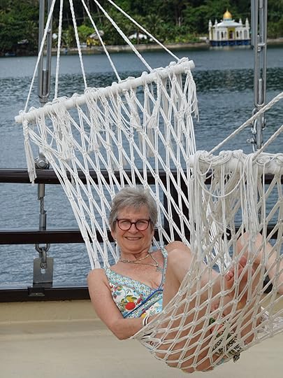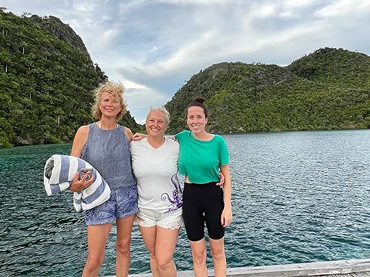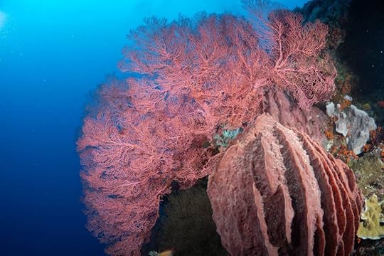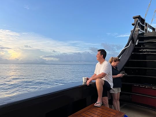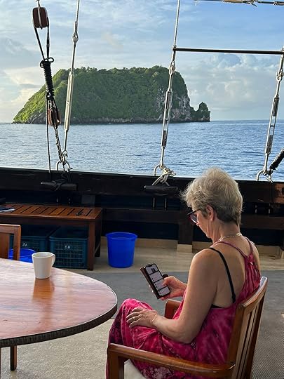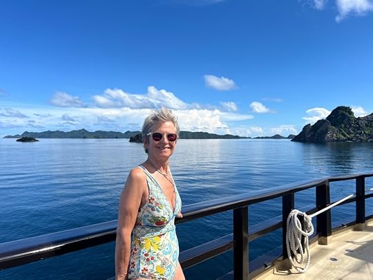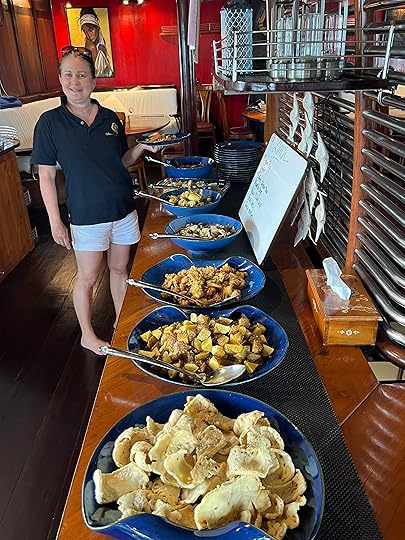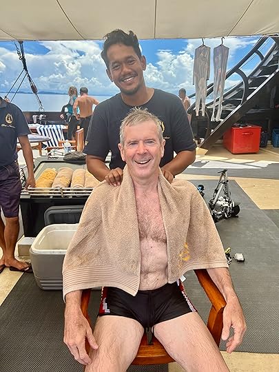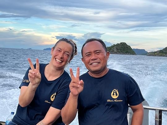Vase spongeThe days pass in a haze of sleep, eat, dive, eat, dive, eat, dive, eat and finally sleep – although Ross goes on several night dives and even I do one! When it’s fine, we read on the deck, sip G&T or Bintang, and chat to Leah, Julian, Simon and Eira and enjoy giggles with our Canadian influencer Edina, who knows how to party! The after-dive shoulder rubs are a treat! The food is, as ever, delicious, under the supervision of Hendricks, the major domo.