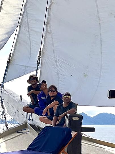 Clockwise: us with Tamrin, ready to jump; Tamrin with Ambon city in the background; Ross listening to Yan giving the briefing; Aurelie (cruise director) and Steven, who we have dived with twice; the crew putting the sails up and taking a rest; briefing in session