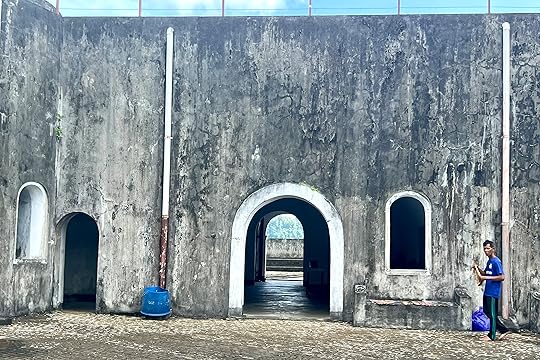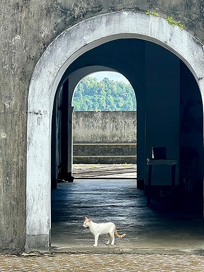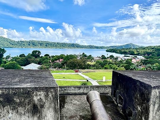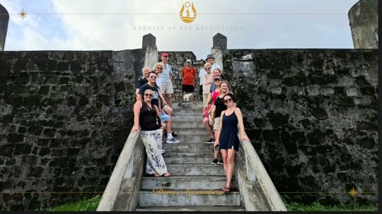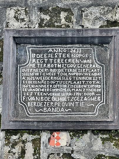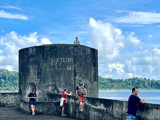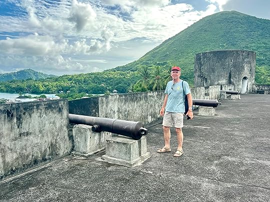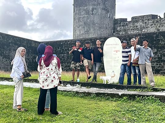 You can see Rhun as it was called then on the west of the mapWe take time out from the boat to explore the ancient Fort Belgica, bult by the Dutch in 1611, to control the local ruling tribe. They were terrible colonists and the Banda Massacre of 1611 began a genocide of the local inhabitants, later aided by the presence of imported Samurai warriors. There are gruesome paintings depicting all of this in the Banda Neira Museum. The fort is quite magnificent as you can see – and we are guided by a friendly local cat who also insisted on being in the photo with the Indonesian students!