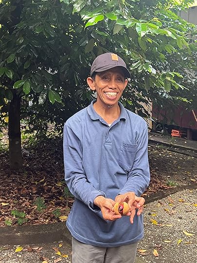 Clockwise: Our American guest gave sweets to these girls (very bad form, the one thing you should never give – but they were pleased); Ross trying a nutmeg delicacy; the pandanus rolls were rather delicious but very sweet; our guide showing us nutmeg and mace inside the outer casing; the sales pitch; the graffiti; volcanos are everywhere;