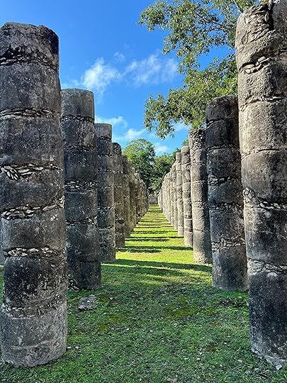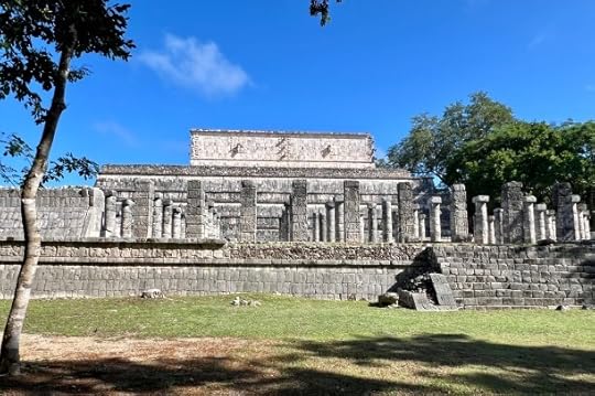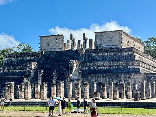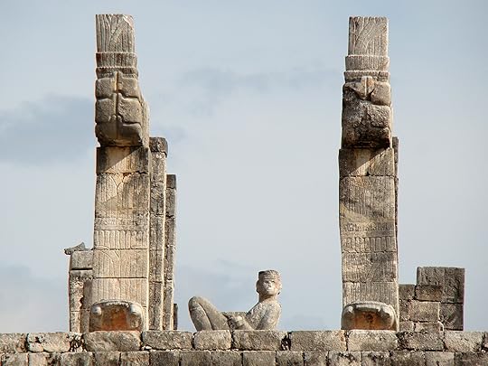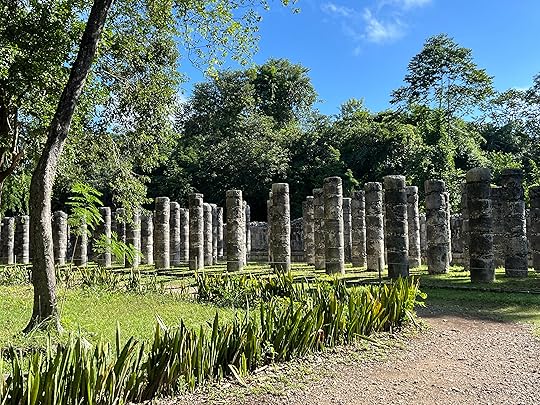 The Jaguar Throne inside the Temple of Kukulcán pyramid is red and inlaid with jadeThe Temple of the Warriors complex (below) consists of a large stepped pyramid fronted and flanked by rows of carved columns of eagles and jaguars, representing the warriors. At the top of the stairway on the pyramid’s summit (and leading toward the entrance of the pyramid’s temple) is a Chac Mool, a messenger to the gods – one of the only photographable ones we see outside of a museum. It is abutted by the Plaza of 1000 columns – really splendid (see below).