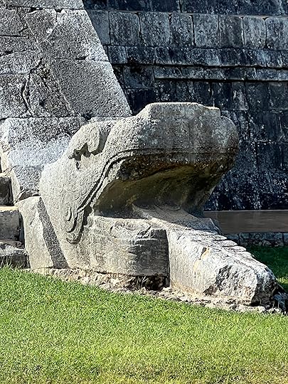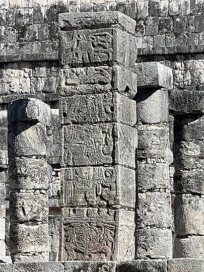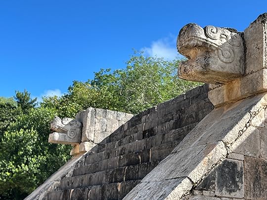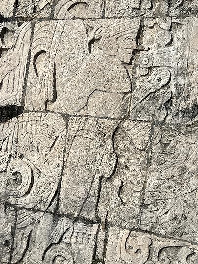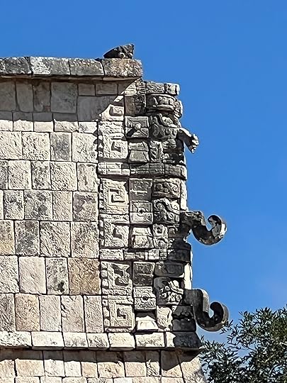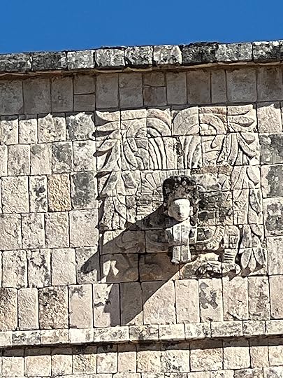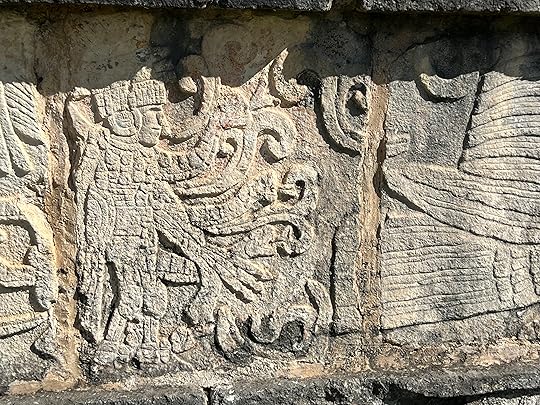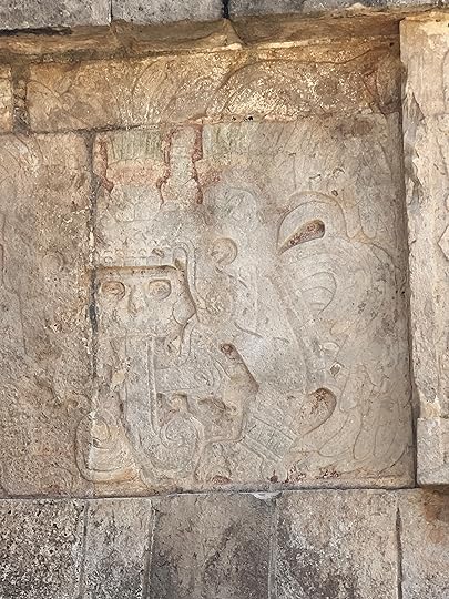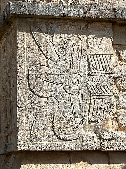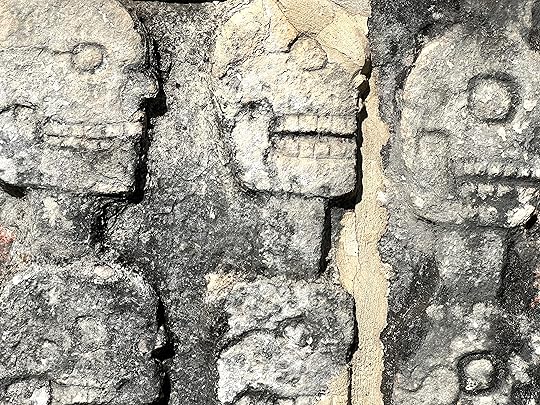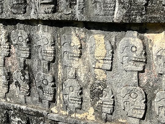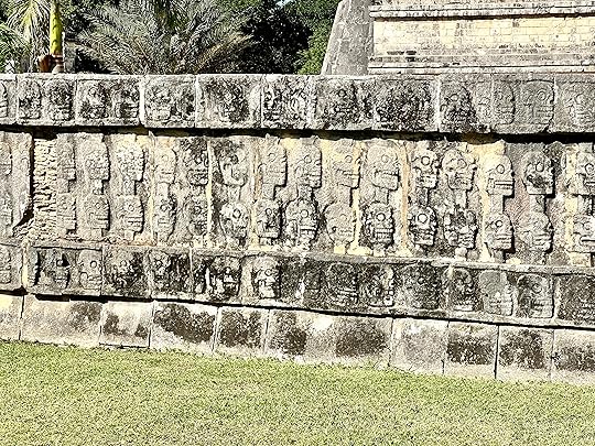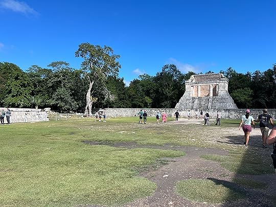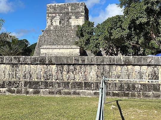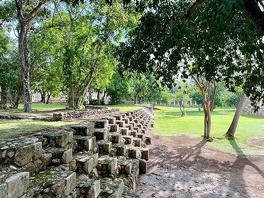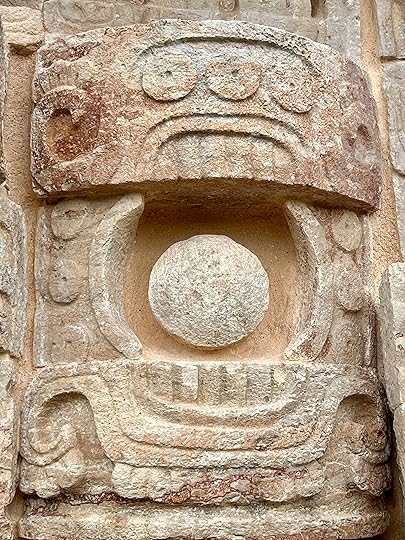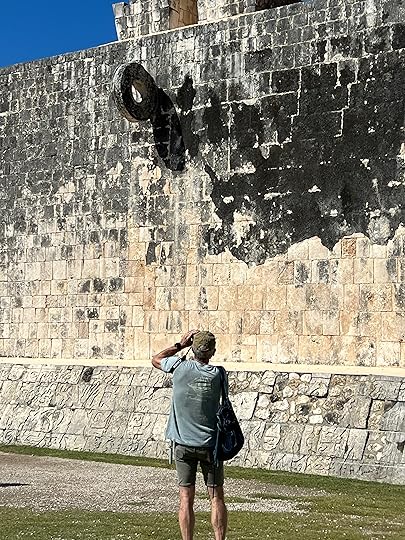 The Great Ball Court is also part of the central complex; we saw another at Uxmal. The game of pelota was ceremonial with two teams who had to get the ball through a polo-shaped hoop, using only their bodies – no hands or feet allowed! It is absolutely enormous – and is largely empty when we visit.