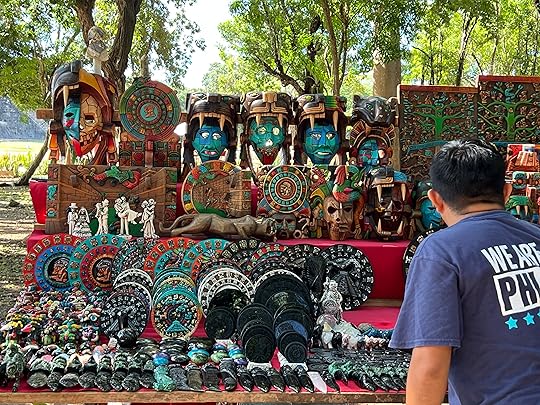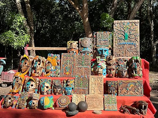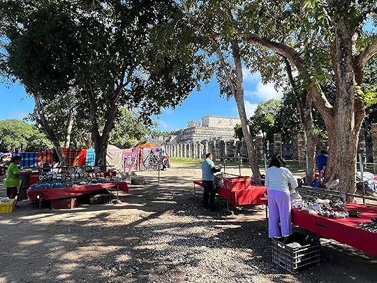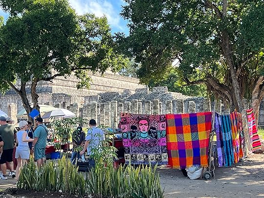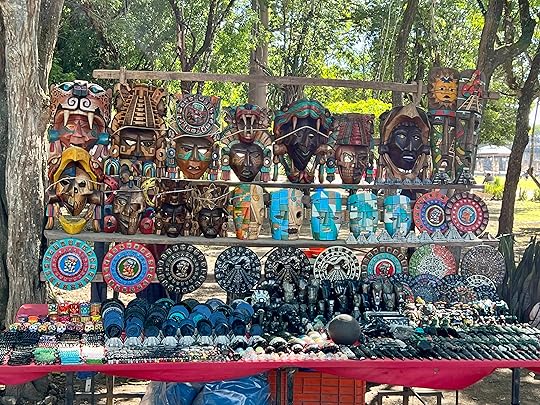 All are connected by the remnants of great walkways. Rather spoiling the serenity of the sacred site are hundreds of tourist stalls, selling probably mostly made-in-China tat…I always wonder who buys it, as they all seem to be selling the same thing. However, we hear that the government has given them all notice to quit next year – a desperate situation for all the vendors who have congregated from far and wide to work here. Later at Uxmal, it is notable that a site clear of vendors is much more magical.