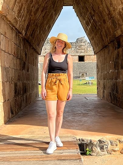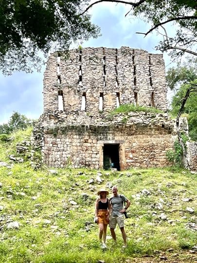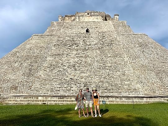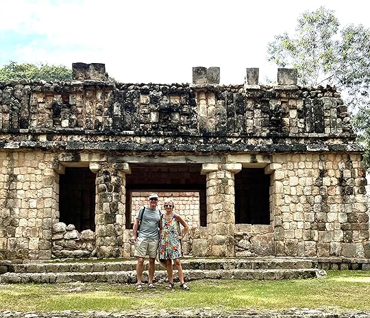 We pose for photos in the arch leading to the Pelota or ball court, another magnificent structure. On the right is the famous Casa de las Tortugas (House of the Turtles) – turtles were associated with the Mayan rain god, Chaac and in their mythology when they suffered from drought so did the turtles, hence a temple to pray for them.