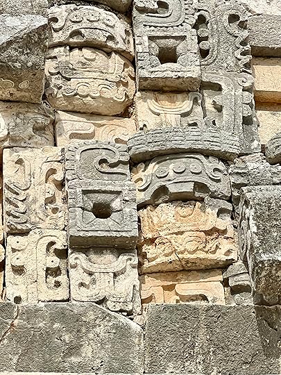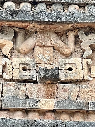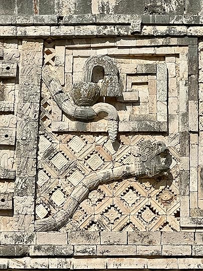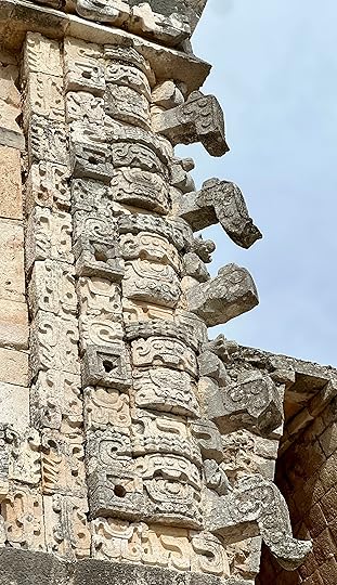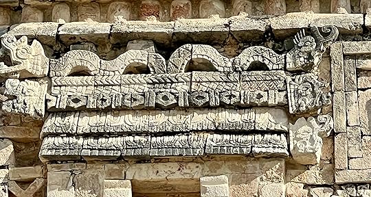 Skirting round the pyramid, you get to the Cuadrangulo de las Monjas, or Quadrangle of nuns, highly decorated with long-nosed images of Chaac, accompanied by the motif of the now familiar feathered serpent, Quetzalcoatl or Kukulcan in Mayan.
