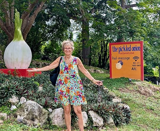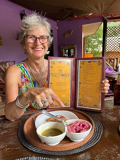 All that’s left of El Mirador, another great pyramidThe rain is still hovering so we retrace our steps to the nearby town of Santa Elena, where I have been lured to the local hostelry called The Pickled Onion – one of my childhood nicknames. I simply can’t resist! Unsurprisingly we are the only people there, but we have a pleasant enough meal -including pickled onions, in red below.
